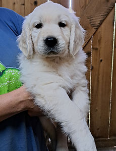 Our puppies and dogs are raised with lots of positivity, love, guidance and understanding...zero stress / trauma... and that creates tons of canine joy! Puppies are allowed to stay with their dam through the weaning process which always happens around the seventh week...so important as the dam is a constant role model and the first one to teach the puppies good manners and "No." Here, growing puppies have plenty of room to play and develop physically. They are handled and socialized daily. Playful Golden pups calm down immediately as soon as a human picks them up. Visitors and the staff at the vet's office told us, "You have very happy dogs".